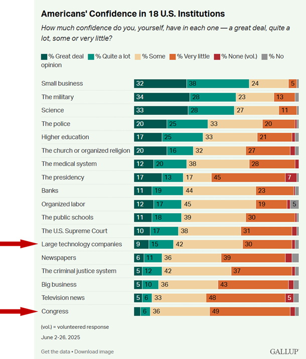 Congress needs to divert its time and attention to making law and/or amending existing law to protect the public from ever-evolving threats of harm. While industry’s aversion to publicly criticizing lawmakers for inaction is understandable, the public would likely welcome it. Congress is vulnerable. According to a June 2025 Gallup poll, Americans’ confidence in this esteemed institution continues to nosedive.